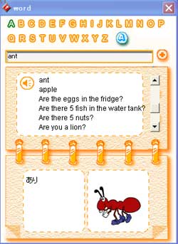 ![]() | 2) 単語確認ページ ・耳から、目から、単語を学習できるページです。各シナリオでの基本学習テーマのみを確実に定着させることができます。初めはわからなくても大丈夫。間違った答えを選ぶと、音で教えてくれますから、自然と正しい単語を覚えることができます。 |